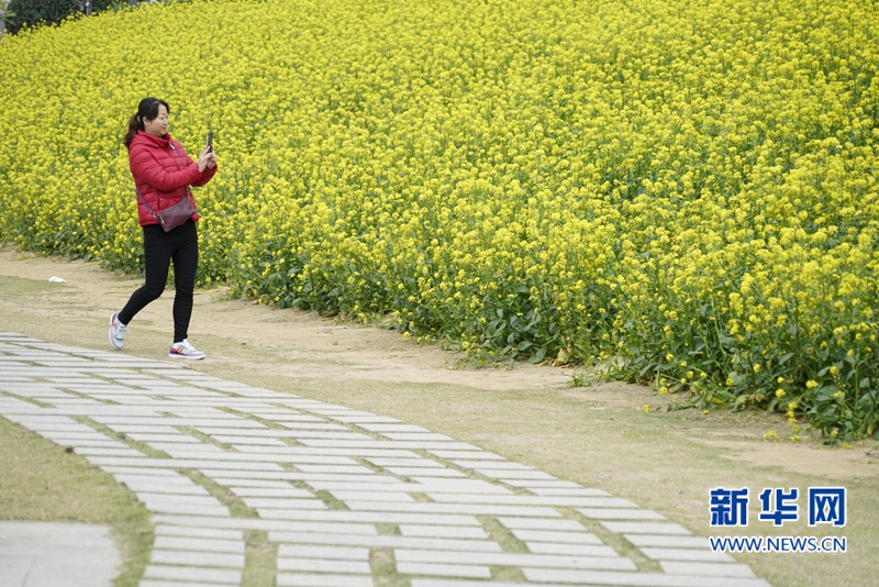 近日,福建省福州市天氣宜人,花海公園近百畝油菜花提前盛開,吸引不少游人前來賞花。