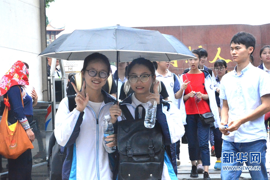 考生走出考場,對著家長比出勝利的手勢。新華網 王雄攝