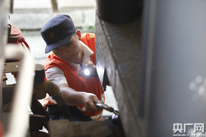 央廣網(wǎng)福州9月12日消息(記者萬存靈)入秋以來,福州車輛段對經(jīng)過一個夏季奔跑圖定編組的47組845輛旅客列車進行秋季整修,消除車輛高頻運轉(zhuǎn)的故障隱患,“90后”車輛乘務(wù)長顏其正在對列車運行狀態(tài)進行巡查!耙惶肆熊囈话18節(jié)車廂,我們一個班八個小時,2小時要巡查一次,如果出現(xiàn)突發(fā)故障我們要及時處理,保障列車安全和旅客舒適!