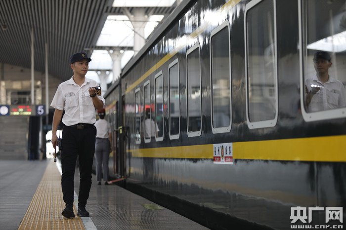 圖為顏其正在站臺上對始發(fā)列車車廂進行檢查巡視(央廣網(wǎng)發(fā) 胡鵬 攝)