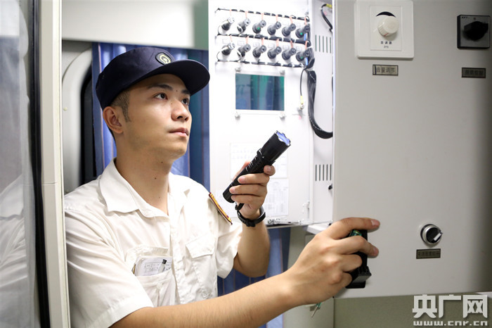 圖為顏其正在對車廂各項設(shè)備設(shè)施進行巡視檢查(央廣網(wǎng)發(fā) 王玉星 攝)