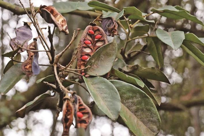 據(jù)明溪縣城關(guān)中學(xué)退休教師鄧根榮介紹,花櫚木在當(dāng)?shù)乇挥H切地稱為紅豆樹,那一顆顆圓潤(rùn)的紅豆,自古以來(lái)就被賦予了深厚的相思之意。在當(dāng)?shù)氐膫鹘y(tǒng)習(xí)俗中,人們會(huì)將花櫚木種植在先人的墓地上,以此來(lái)寄托對(duì)逝者無(wú)盡的思念與緬懷之情。這種獨(dú)特的文化傳統(tǒng)深深地扎根在當(dāng)?shù)孛癖姷男闹校沟没澳境蔀榇蠹倚闹械纳駱,人們?duì)其充滿敬畏,從來(lái)沒(méi)有人敢對(duì)它們進(jìn)行砍伐破壞。在歲月的長(zhǎng)河中,花櫚木在這片土地上默默地生長(zhǎng)、繁衍,歷經(jīng)多年的自然孕育與沉淀,終于形成了如今這片全省罕見(jiàn)的大面積野生群落。