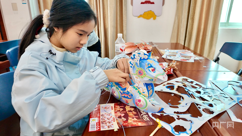 傳統(tǒng)花燈體驗(yàn)區(qū)成為孩子們的樂園,玲瓏魚燈、鰲魚燈、走馬燈等制作材料整齊擺放,小朋友們圍坐一起,在工作人員的指導(dǎo)下裁剪、粘貼、組裝,親手打造專屬新春花燈!翱粗约鹤龅聂~燈亮起來,特別有成就感,還學(xué)到了傳統(tǒng)手藝!”一名參與制作的小朋友興奮地說。紅燈高掛映照出一份共慶新春的美好圖景。
