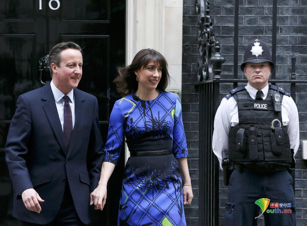 當(dāng)?shù)貢r(shí)間2015年5月8日,英國(guó)倫敦,英國(guó)首相卡梅倫攜妻離開唐寧街10號(hào),將前往白金漢宮會(huì)見英國(guó)女王。 (供圖:CFP)