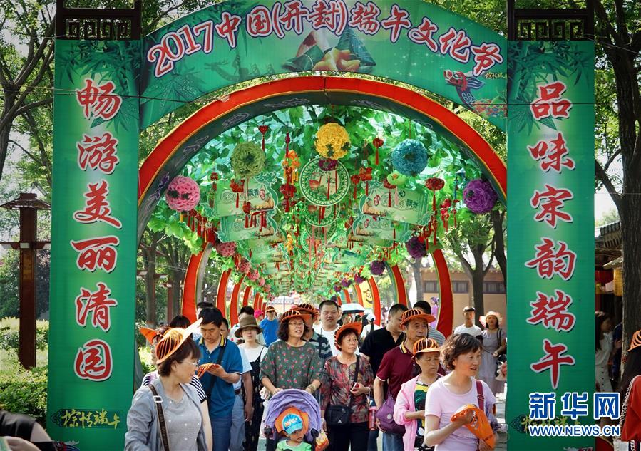 5月28日,在河南省開封市的清明上河園景區(qū),游客們經(jīng)過端午文化節(jié)主題走廊。 當(dāng)日是端午小長假的第一天,全國各地舉行豐富多彩的活動,迎接端午節(jié)到來。 新華社記者 李安 攝 -