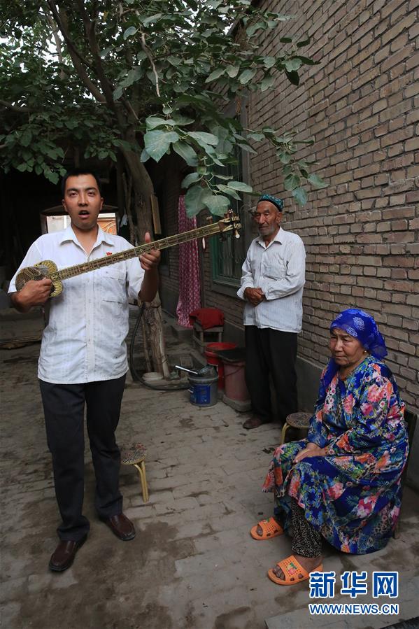 2008年做完白內(nèi)障復(fù)明手術(shù)的艾依依孜·克里木(左)在家中為父母彈奏熱瓦普(6月17日攝)。新華社記者 李明放 攝 -