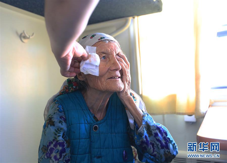 6月17日,在“健康快車”上,做完白內(nèi)障復(fù)明手術(shù)的女患者在接受視力檢查。新華社記者 李明放 攝