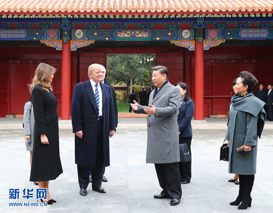 •   11月8日下午,國家主席習近平和夫人彭麗媛在北京故宮博物院迎接來華進行國事訪問的美國總統(tǒng)特朗普和夫人梅拉尼婭。兩國元首夫婦在寶蘊樓簡短茶敘。新華社記者 蘭紅光 攝
