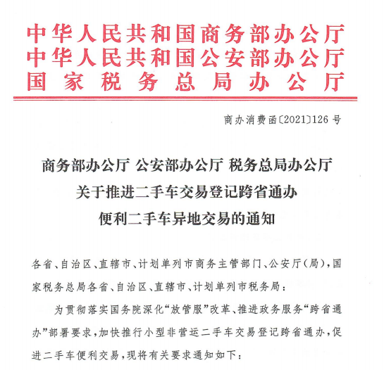 此外,《通知》對政策落地實施進度做了具體部署,明確2021年6月1日起,在天津、太原、沈陽、上海等20個城市試點推行小型非營運二手車異地交易登記;自2021年9月1日起,直轄市、省會市、自治區(qū)首府市、計劃單列市全部推行;2022年全國全面推行。