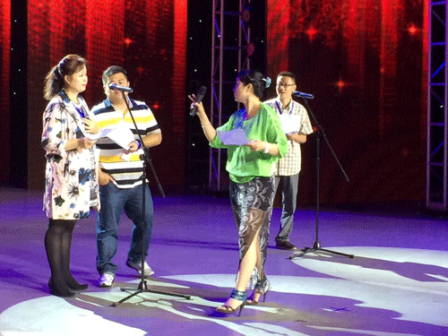 本劇組成員構(gòu)成,有來(lái)自余姚臺(tái)的總監(jiān)凌宏、李曼、主播婁城、還有來(lái)自鄭州臺(tái)的劉陽(yáng)副主任,在拿到劇本后,劇組成員都表現(xiàn)出了無(wú)比熱烈的認(rèn)真勁,讓我在感動(dòng)之余熱力四射。大家利用休息時(shí)間,開始了彩排。根據(jù)劇情我對(duì)劇本作了一些必要的增加與修改,大家經(jīng)過反復(fù)磨合后,終于完成任務(wù)。正式上臺(tái)后,全體同仁超水平發(fā)揮,頓時(shí)贏得滿堂喝彩!在舞臺(tái)排練時(shí),大家又熱情洋溢地用方言版演繹了一遍,感覺很不錯(cuò)。于是,當(dāng)普通話版正式錄制完成后,本劇組成員便主動(dòng)要求上演一出方言的升級(jí)版表演,效果驚人,立即將場(chǎng)內(nèi)觀眾的情緒推向了高潮,爆笑連連……特別是劉陽(yáng)的河南方言絕對(duì)地道搞笑。秘書長(zhǎng)高坦對(duì)劇組成員的高水平發(fā)揮和演繹,給予了高度評(píng)價(jià),當(dāng)即決定讓其他劇組全部加一次方言版的表演。如此快樂的表演,引來(lái)場(chǎng)內(nèi)廣播人一陣陣瘋狂的大笑,那一刻,沒有什么能讓我們這群廣播劇人不快樂的!
