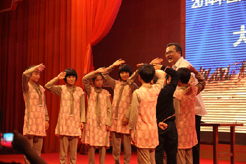這次大聯(lián)歡中,既有活潑的歌舞如浪花跳躍,也有深沉的表演如鐘鼎之鳴。舞臺廣播劇《我有一片陽光》取材于寧夏廣播電視臺和深圳寶安臺同名廣播劇,該作品榮獲了第十三屆五個一工程大獎。該劇以支邊教師馮志遠(yuǎn)的事跡為素材,擷取他失明之前一段特別的人生時刻作為切入點(diǎn),生動展現(xiàn)了他與艱苦邊遠(yuǎn)地區(qū)學(xué)生的珍貴情誼。舞臺上扮演馮老師的是沈陽臺的廣播劇導(dǎo)演宋曉,年輕的宋導(dǎo)特意染白了頭發(fā),當(dāng)他深情俯瞰“自己的學(xué)生”時,眼里跳動的淚花,折射著馮老師對這群孩子的愛。劇中扮演學(xué)生的孩子們,來自于銀川市穆斯林孤兒院,對于舞臺他們是陌生的,可對于人世間的真情他們懂得,并且渴望,當(dāng)“馮志遠(yuǎn)老師”帶著他們合頌《岳陽樓記》時,臺下的觀眾分明看到了孩子眼中的淚光。