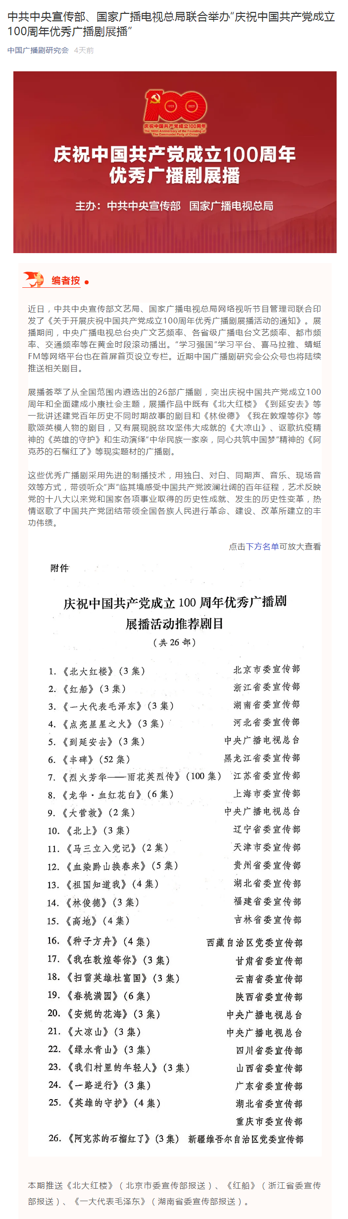中國廣播劇研究會(huì)成立于1980年,它是全國廣播系統(tǒng)成立最早的社團(tuán)之一。多年來,中國廣播劇研究會(huì)認(rèn)真貫徹執(zhí)行黨的各項(xiàng)文藝方針、政策、積極開展工作,組織業(yè)務(wù)交流和理論研究活動(dòng),扶植各臺(tái)進(jìn)行劇目創(chuàng)作。從1984年開始,組織創(chuàng)辦了全國廣播劇評(píng)獎(jiǎng)活動(dòng),對(duì)中國廣播劇事業(yè)的繁榮和發(fā)展起到了推動(dòng)作用。