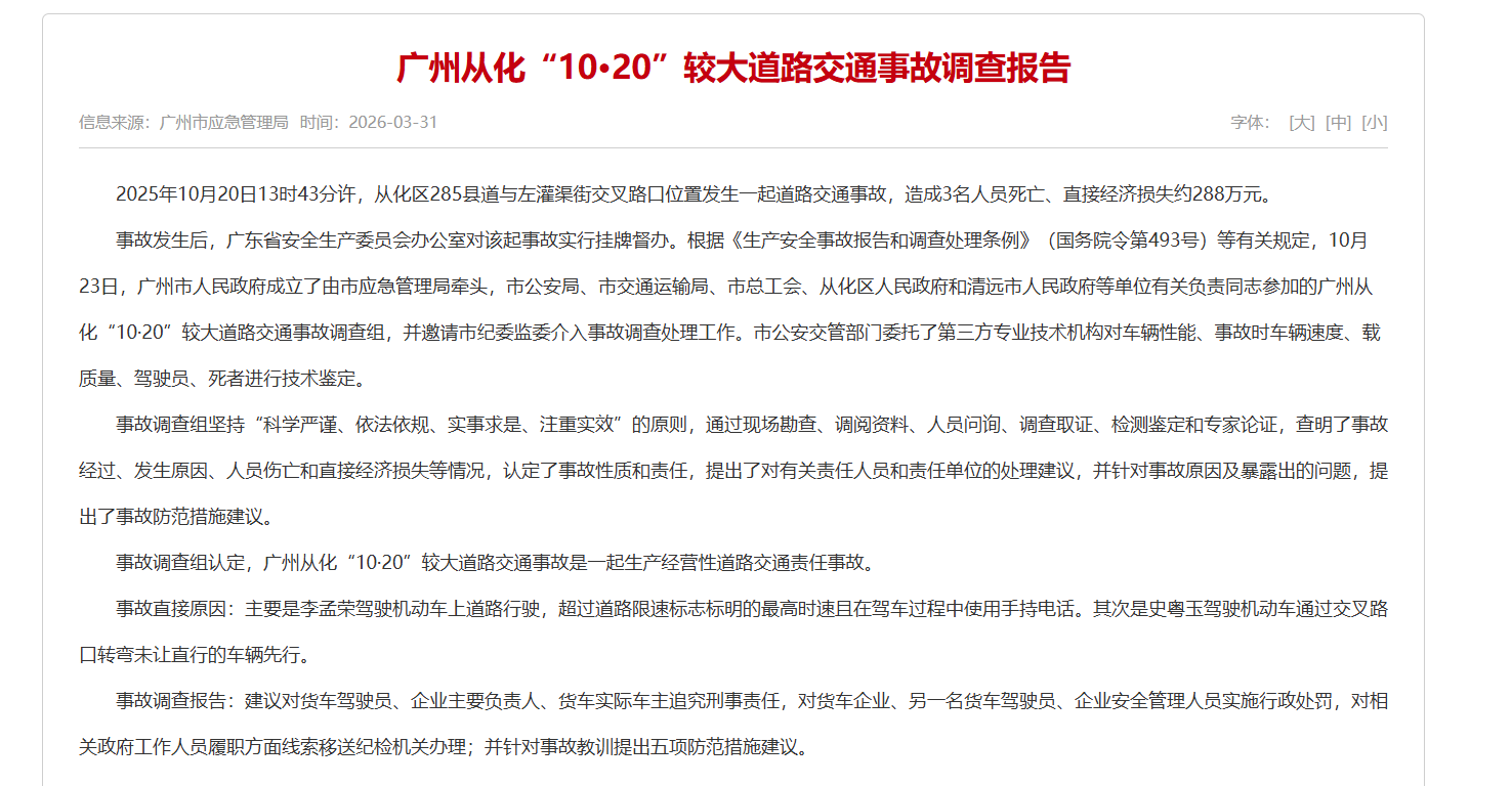 事故調(diào)查組認定,廣州從化“10·20”較大道路交通事故是一起生產(chǎn)經(jīng)營性道路交通責任事故。