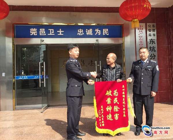 價值約185萬元的金錢龜、石金錢龜失而復(fù)得,事主盧先生甚為感概。他專門制作了錦旗,與東莞市龜業(yè)研究會有關(guān)負責(zé)人前來東坑公安分局道謝。盧先生緊緊握住辦案民警的手,顯得很激動。