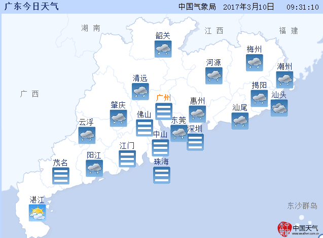 廣東省氣象臺(tái)預(yù)計(jì),10日起受偏南暖濕氣流和高空槽影響,粵北市縣有中雨,全省溫濕逐步上升,早晚有輕霧或霧,能見度偏低。
