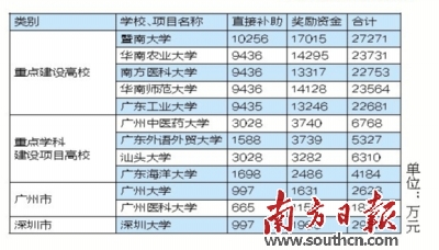 根據(jù)公示方案,今年廣東將投入15億元支持高水平大學(xué)建設(shè)。其中,超過(guò)14.2億元投入9所省屬學(xué)校,暨南大學(xué)、華南農(nóng)業(yè)大學(xué)、南方醫(yī)科大學(xué)、華南師范大學(xué)、廣東工業(yè)大學(xué)5所高水平大學(xué)重點(diǎn)建設(shè)高校獲2.2億元—2.7億元不等的專(zhuān)項(xiàng)資金;廣州中醫(yī)藥大學(xué)、廣東外語(yǔ)外貿(mào)大學(xué)、汕頭大學(xué)和廣東海洋大學(xué)4所重點(diǎn)學(xué)科建設(shè)項(xiàng)目高校共獲超2.2億元的資金支持。