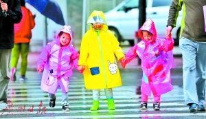 三個(gè)小朋友放學(xué)回家時(shí)穿上了卡通雨衣,快樂(lè)地牽著手過(guò)馬路。廣報(bào)記者邵權(quán)達(dá)攝