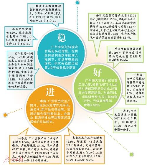 廣州市統(tǒng)計局?jǐn)?shù)據(jù)顯示,一季度,廣州實體經(jīng)濟穩(wěn)定發(fā)展勢頭在增強,在供給側(cè)結(jié)構(gòu)性改革的深入推進(jìn)下,市場環(huán)境趨向好轉(zhuǎn),供求關(guān)系逐步改善,經(jīng)濟效益穩(wěn)步提高。一季度,主要先行指標(biāo)逐步向好。