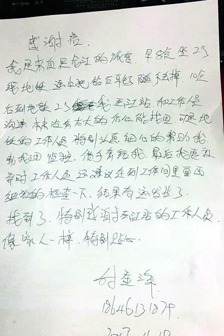 在經(jīng)歷了整整兩個(gè)小時(shí)的翻找后,匡小娟與付小姐終于發(fā)現(xiàn)了那包裹著鉆石耳釘?shù)募埥,鉆石耳釘失而復(fù)得,付小姐的歡喜溢于言表,“能夠找回真是奇跡,地鐵工作人員像家人一樣,特別貼心”。