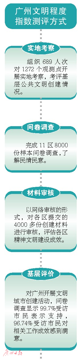 據(jù)大洋網(wǎng)報(bào)道,日前,廣州市文明辦發(fā)布了2016年度城市文明程度指數(shù)測(cè)評(píng)成績(jī),顯示2016年廣州文明程度指數(shù)測(cè)評(píng)平均分為87.69分,市直部門專項(xiàng)測(cè)評(píng)平均分為90.99分,全市年度測(cè)評(píng)得分高于上一年,城市文明和市民素質(zhì)呈逐年提升之勢(shì)。