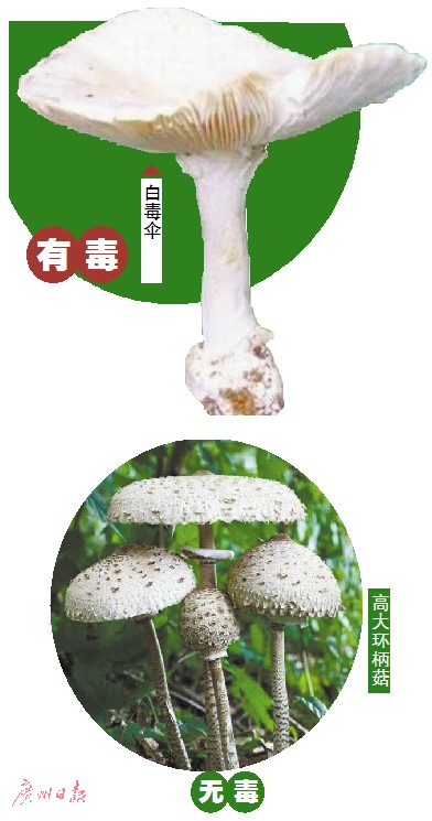 今年3月24日,來自重慶的黃伯在花都洪秀全水庫見山上長了一大片鮮嫩的白色野蘑菇,就采了大約1斤跟鴨蛋一起煮面條與妻子、女兒、女婿同時進食。當天4人出現(xiàn)惡心、嘔吐、腹痛腹瀉、乏力、尿黃、眼黃等癥狀,查出嚴重的肝損害。無獨有偶,同日在江門市打工的湖南民工姜女士在圭峰山采了七八兩鮮嫩的白色野蘑菇,炒肉吃后出現(xiàn)劇烈嘔吐、腹痛腹瀉,送醫(yī)后也查出嚴重肝損害。這兩批病人送到廣州市第十二人民醫(yī)院,幸虧及時救治都轉危為安。姜女士的1名老鄉(xiāng)同時也采食了圭峰山的野蘑菇,同樣出現(xiàn)嚴重中毒癥狀,在當?shù)負尵葻o效死亡。經(jīng)廣東省微生物研究所鑒定,這兩起肇事蘑菇正是白毒傘。