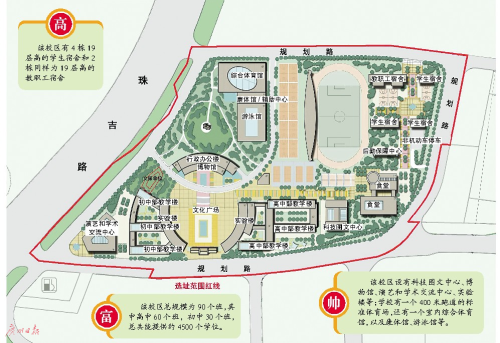 從規(guī)劃圖中看,執(zhí)信天河校區(qū)可謂高標準配置,教學(xué)樓分為高中部和初中部兩部分,有4棟19層高的學(xué)生宿舍和2棟同樣為19層高的教職工宿舍。此外,還有科技圖文中心、博物館、演藝和學(xué)術(shù)交流中心、實驗樓等;體育設(shè)施方面,學(xué)校有一個400米跑道的標準體育場,還有一個室內(nèi)綜合體育館,以及康體館、游泳館等。