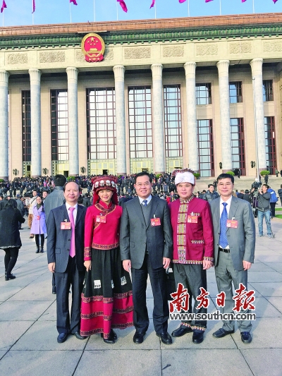 在清遠(yuǎn)居住或工作的郭鋒(左三)、周海波(左一)、賴?yán)ず椋ㄓ乙唬Ⅰ狠x(左二)、何桂芳(右二)5名全國人大代表在人民大會(huì)堂門前合影。張永成 攝