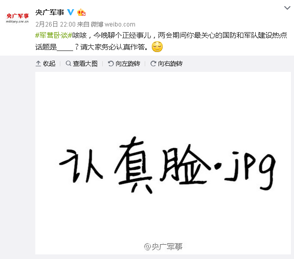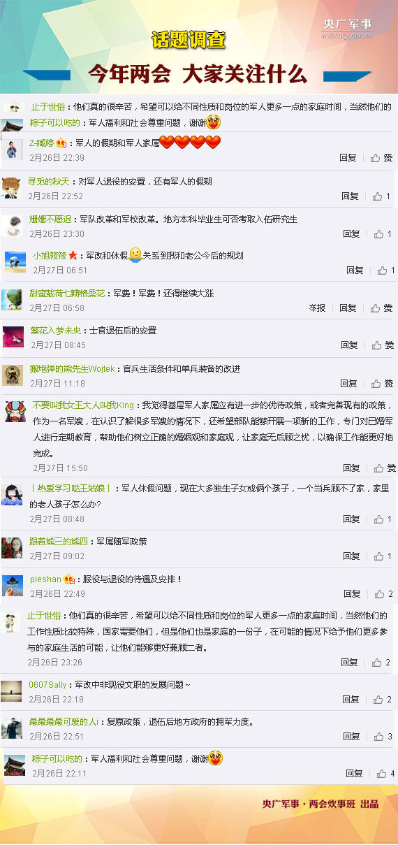 3月10日的兩會炊事班,小編們梳理了關(guān)于軍人權(quán)益的那些事兒,今天,焦點對準網(wǎng)友,看看網(wǎng)友給央廣軍事留的“作業(yè)”,記者們到底完成沒有?