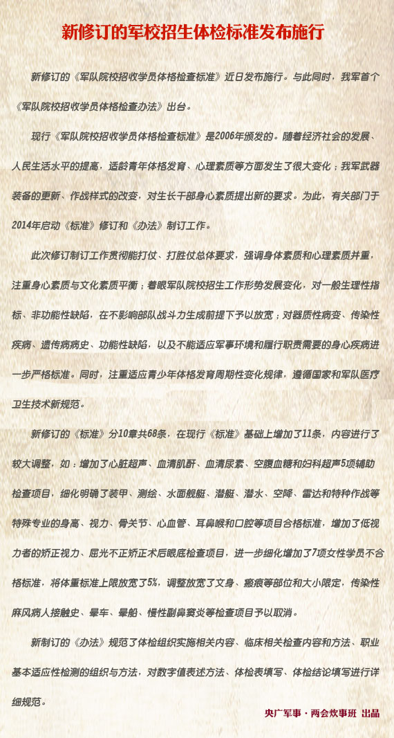小編發(fā)現(xiàn),不少網(wǎng)友留言的問題都是如何考軍校?軍校到底招收什么樣的人?文科生能考軍校嗎?等等問題。小編可以負責任的告訴你,只要你的條件符合報考要求,身體素質(zhì)、政審等也沒什么問題,就可以報考軍校。國防部剛剛發(fā)布了《新修訂的軍校招生體檢標準發(fā)布施行》,小編已整理,請看下圖。