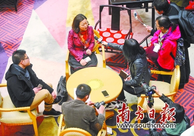 11日是代表休息日,沒有外出的黃細(xì)花代表(中)被記者邀請到廣東團(tuán)駐地接受采訪。