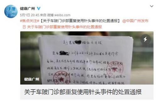 中新網(wǎng)報(bào)道: 日前,廣州市天河區(qū)車(chē)陂門(mén)診部被曝存在“小孩抽血一個(gè)針頭兩個(gè)人用”的情況。1日晚,廣州市衛(wèi)生和計(jì)劃生育委員會(huì)通過(guò)官方微博做出通報(bào),通報(bào)稱(chēng),該門(mén)診部檢驗(yàn)科為患兒扎手指采血人員黃某存在有用一個(gè)針頭給兩個(gè)人采血的行為。天河區(qū)衛(wèi)計(jì)局經(jīng)過(guò)摸底調(diào)查,排除日常末梢采血技術(shù)操作存在重復(fù)使用針頭的情況。該事件屬檢驗(yàn)人員操作不當(dāng)?shù)膫(gè)案。