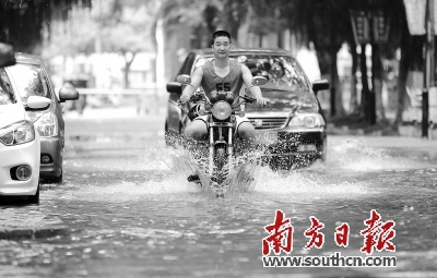 6日下午,一場(chǎng)暴雨過后,中山一名市民騎車蹚水而過。記者 葉志文 攝