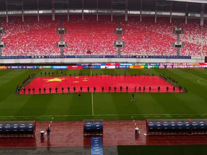 在這場(chǎng)矚目的“廣東德比”打響之前,一場(chǎng) “我和我的祖國(guó)”主題快閃活動(dòng)在體育場(chǎng)內(nèi)舉行,全場(chǎng)3萬(wàn)球迷配合國(guó)旗傳遞快閃,高聲歌唱《我和我的祖國(guó)》!