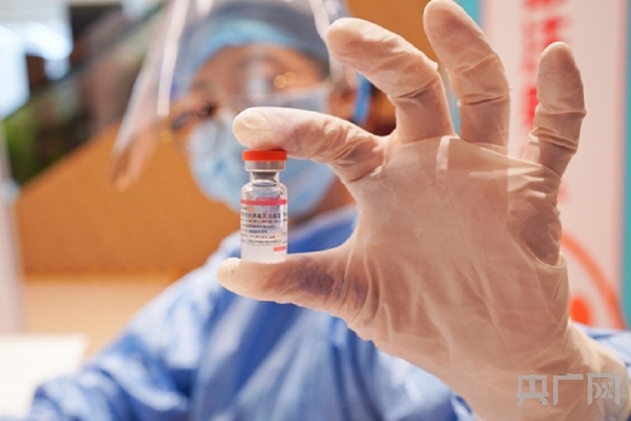 護(hù)士向記者展示當(dāng)天接種的新冠疫苗。(央廣網(wǎng)記者 官文清 攝)