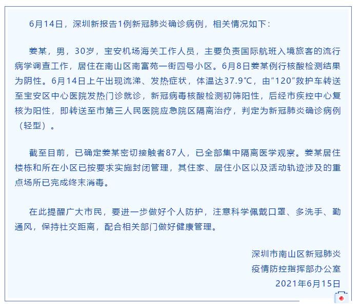 據(jù)深圳市南山區(qū)新冠肺炎疫情防控指揮部辦公室下午通報,6月14日,深圳新報告1例新冠肺炎確診病例,相關(guān)情況如下: