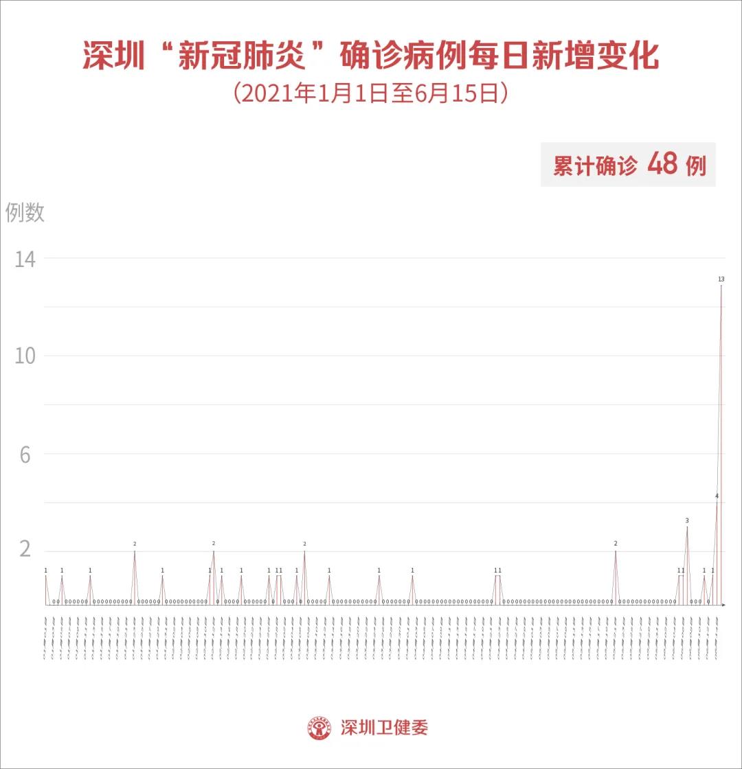 6月15日0-24時,深圳新增13例境外輸入確診病例和12例境外輸入無癥狀感染者。