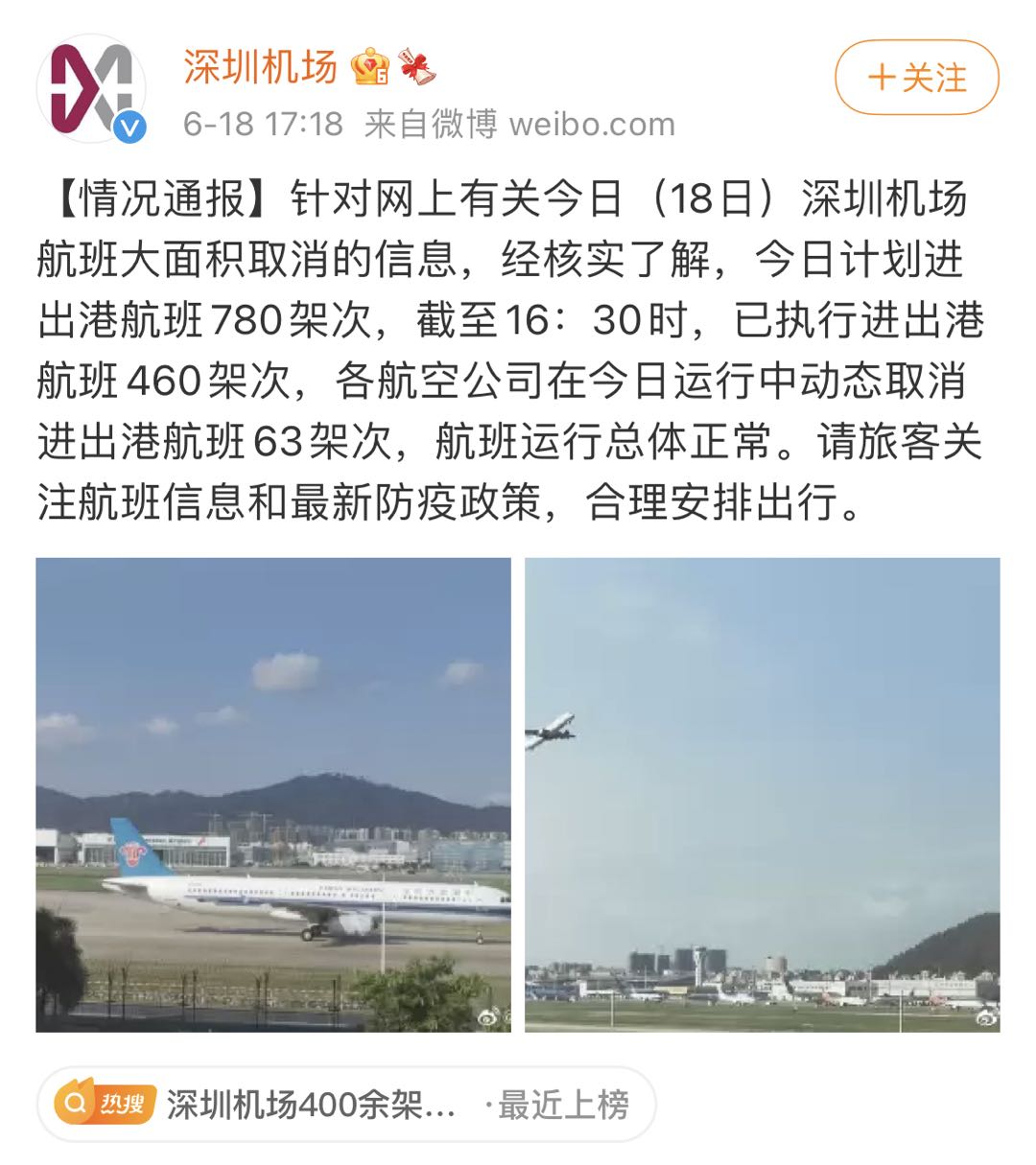 據(jù)深圳機(jī)場官方微博消息,針對網(wǎng)上有關(guān)今日(18日)深圳機(jī)場航班大面積取消的信息,經(jīng)核實(shí)了解,今日計(jì)劃進(jìn)出港航班780架次,截至16:30時,已執(zhí)行進(jìn)出港航班460架次,各航空公司在今日運(yùn)行中動態(tài)取消進(jìn)出港航班63架次,航班運(yùn)行總體正常。請旅客關(guān)注航班信息和最新防疫政策,合理安排出行。