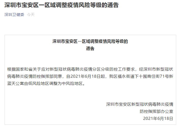 據(jù)深圳市寶安區(qū)新型冠狀病毒肺炎疫情防控指揮部6月18日通報(bào),根據(jù)國家和省關(guān)于應(yīng)對新型冠狀病毒肺炎疫情分區(qū)分級防控工作要求,經(jīng)深圳市新型冠狀病毒肺炎疫情防控指揮部同意,自2021年6月18日起,我區(qū)福永街道下十圍商住街71號新藍(lán)天公寓由低風(fēng)險(xiǎn)地區(qū)調(diào)整為中風(fēng)險(xiǎn)地區(qū)。