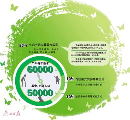 廣州市殯葬管理處處長(zhǎng)梅向陽介紹,骨灰撒海、樹葬還林、花壇葬、草坪葬等新型的節(jié)地殯葬方式約占5%左右。截至目前,全市有6個(gè)(超過一半的)經(jīng)營(yíng)性公墓共推出草坪葬、花壇葬、樹葬、壁(格位)葬4種類型的綠色節(jié)地葬法,共安葬2萬多例骨灰。