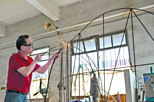 為了便于調(diào)整修改,連接點(diǎn)都是先用扎帶扎,整個(gè)彩燈造型完成后再焊接的。生產(chǎn)車間里,有一匹已經(jīng)成形的馬,中間用方鐵管做支架,身上的焊接點(diǎn)就有幾千個(gè)。陳志棠表示,如果用扎帶連接,不但整個(gè)造型結(jié)構(gòu)不牢固,且捫襯以后的彩燈會(huì)出現(xiàn)凹凸不平。為了不影響效果,有的焊接點(diǎn)還要再打磨一下。