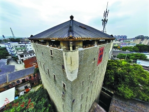 登上庫房第6層,記者看到屋頂四個角位各設有外凸圓柱形鋼筋水泥結(jié)構(gòu)瞭望塔,塔高1.75米,進口處寬0.57米,深度剛好容納一個人。每個瞭望塔面向3個方向開出3個又高又窄的窗口,上方還有一個270度觀察臺,這也是目前廣東唯一發(fā)現(xiàn)有獨特角位的瞭望口。