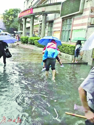 昨日下午3時(shí)許,記者來到洛溪新城小學(xué),校門口路上積水已退去。記者在學(xué)校會議室見到了該校校長鐘世貴,說起赤腳背學(xué)生入校一事,鐘校長很謙虛,“這是最普通不過的一件事了!當(dāng)時(shí),雨很大,不僅我在背孩子,學(xué)校三名保安也在背。”鐘校長說。