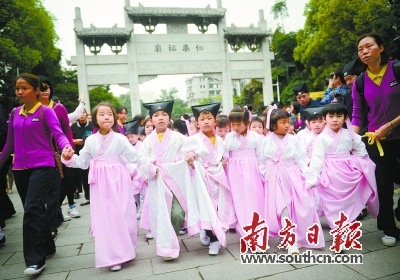 “開筆禮”是中國傳統(tǒng)中對(duì)少兒開始識(shí)字習(xí)禮的一種啟蒙教育形式。在古代,學(xué)童會(huì)在“開筆禮”,即開學(xué)的第一天起床來到學(xué)堂,由啟蒙老師講授人生最基本、最簡(jiǎn)單的道理,并教讀書、寫字,然后參拜孔子像,才可以入學(xué)讀書。