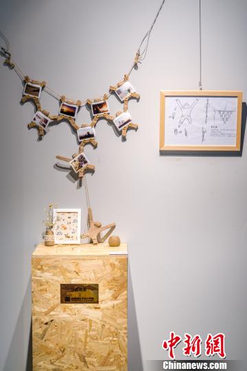 參展作品《攀·回憶》,從猴子撈月的故事里得到啟發(fā),用廢舊棉麻布料做成的照片墻相框。 王謹(jǐn) 攝