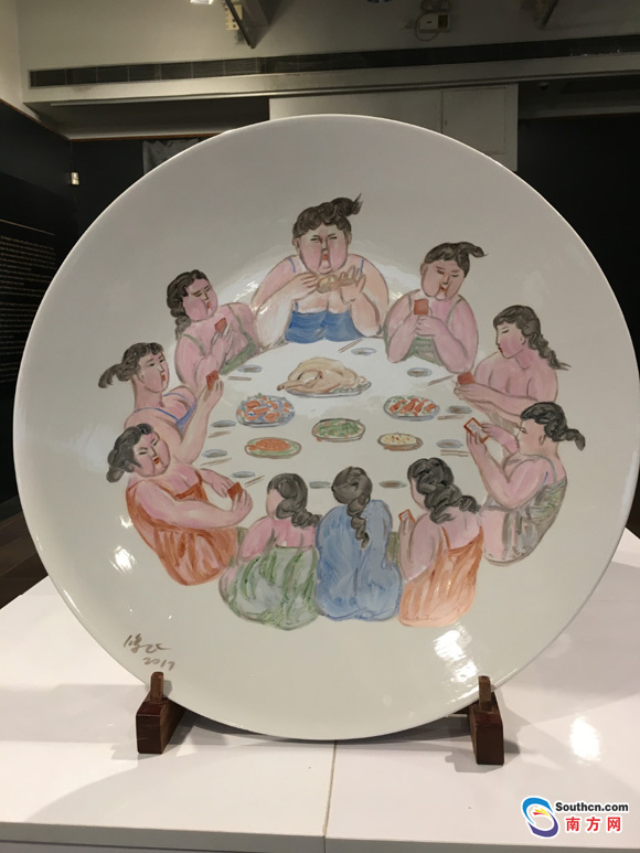 本次展覽策展人、廣州藝術(shù)博物院院長陳偉安介紹,展出作品中最有視覺沖擊力的就是18件直徑61厘米的“海碟”,每一件海蝶上都是肥女形象。有一件作品上,10位肥女圍坐在餐桌前,面對著豐盛的菜肴,每個人都在玩著手機。據(jù)介紹,這些“海碟”是許鴻飛在展期臨近的“逼迫”之下靈感爆發(fā)而創(chuàng)作成的。