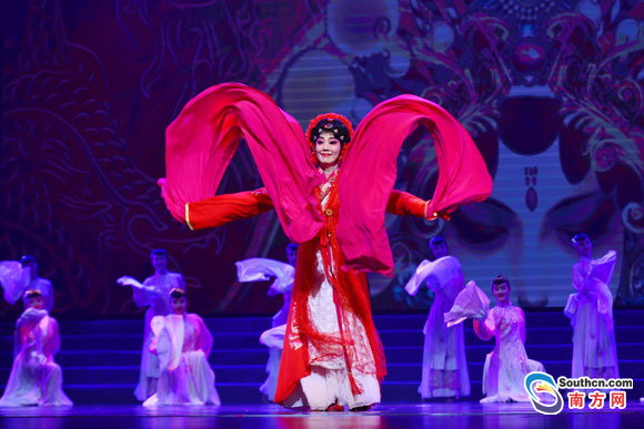 本屆梅花獎(jiǎng)得主蘇春梅以及歷屆梅花獎(jiǎng)獲得者上臺(tái)演繹《紅的歸來(lái)》選段