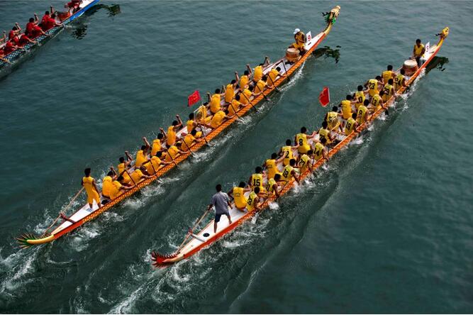 “江水漲,江面闊,大人細路睇龍船!碧旌痈鞔宓凝堉劬跋騺砘鸨鞔遄裾掌瘕、訓(xùn)練、采青、趁景的步驟熱烈地進行著。其中擁有49條龍舟的車陂村,是天河龍舟最多的村。石牌景、獵德景、楊箕景等龍舟景位于廣州CB D,趁景活動全部安排在端午節(jié)正日,將廣州端午節(jié)推向高潮。
