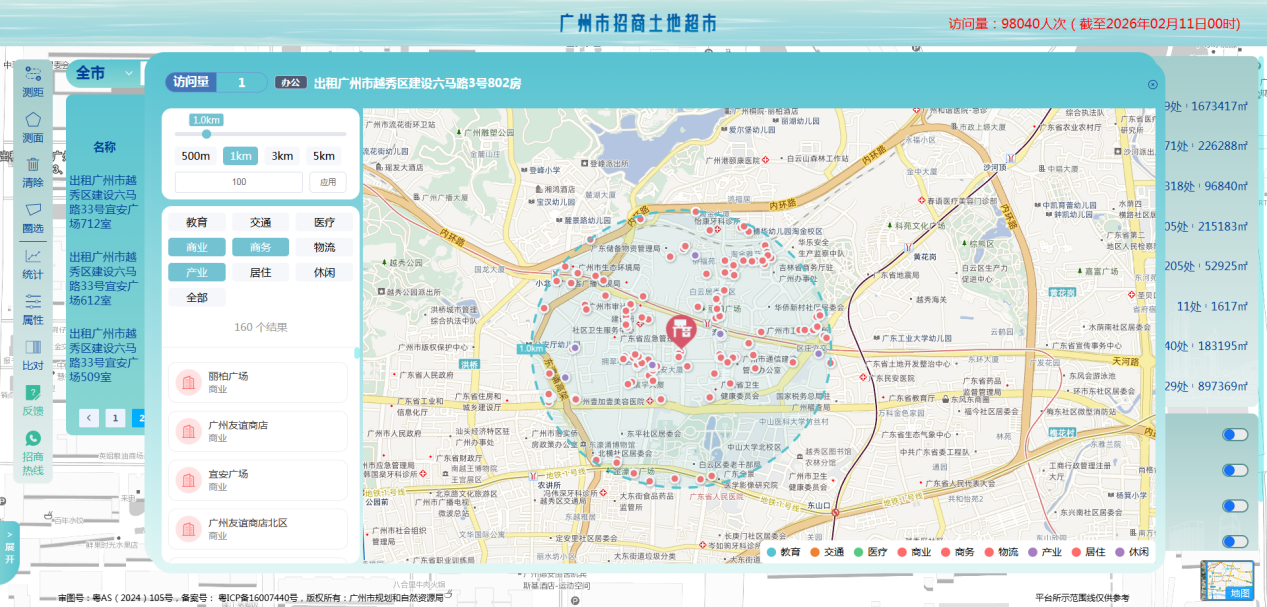 廣州市招商土地超市持續(xù)深化數(shù)智化改革、拓展服務(wù)維度,緊扣2026年全國(guó)自然資源工作會(huì)議“四融合”要求,打破部門界限,主動(dòng)攜手廣州產(chǎn)權(quán)交易所,深度聯(lián)動(dòng)廣州公有物業(yè)出租平臺(tái),全新上線“找資產(chǎn)”功能。此次升級(jí)在原有“選土地”核心服務(wù)基礎(chǔ)上,首次上線涵蓋1479處存量產(chǎn)業(yè)空間的綜合展示平臺(tái),覆蓋市屬行政事業(yè)單位、國(guó)有企業(yè)的商業(yè)、辦公、工業(yè)、倉(cāng)儲(chǔ)等各類物業(yè),支持按投資需求精準(zhǔn)篩選,實(shí)現(xiàn)土地資源與資產(chǎn)空間招商雙軌并行,以協(xié)同高效的工作合力辦成招商服務(wù)實(shí)事,為廣州招商引資提質(zhì)增效、激發(fā)市場(chǎng)活力注入全新動(dòng)能。