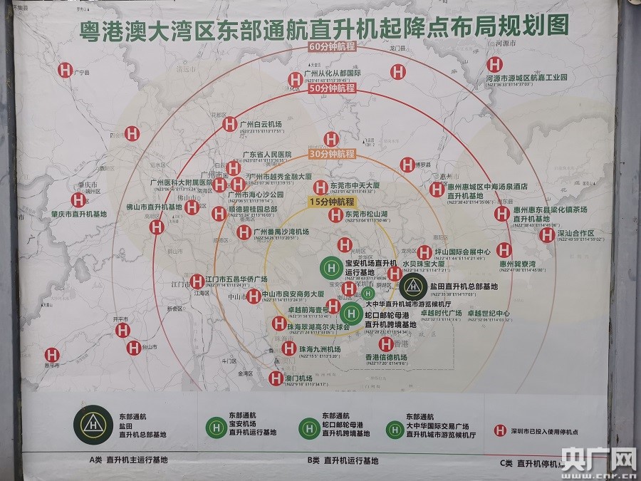 在深圳寶安機(jī)場東部通航基地,記者注意到,有一幅“粵港澳大灣區(qū)東部通航直升機(jī)起降落點布局規(guī)劃圖”,以寶安機(jī)場直升機(jī)運行基地為核心,向整個大灣區(qū)輻射開去。