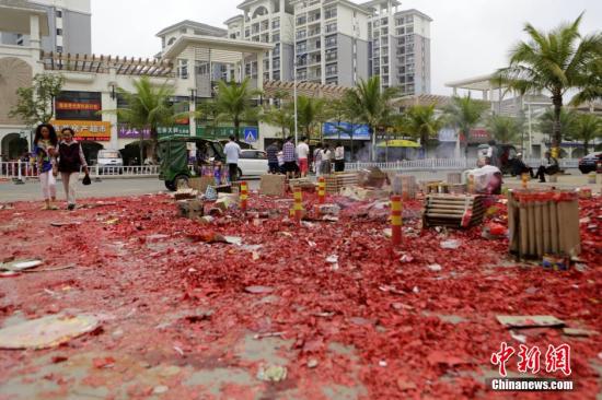 2月19日,海南省萬寧市一小區(qū)門口堆積了大量市民在除夕夜燃放的煙花爆竹垃圾。